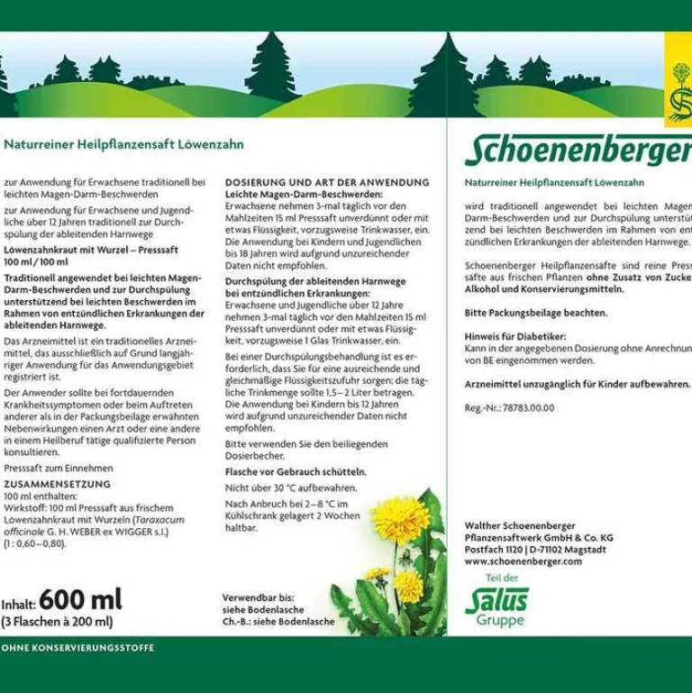 Wirkstoff: 100 ml Presssaft aus frischem Löwenzahnkraut mit Wurzeln (Taraxacum officinale G. H. WEBER ex WIGGER s.l.) (1 : 0,60 – 0,80).