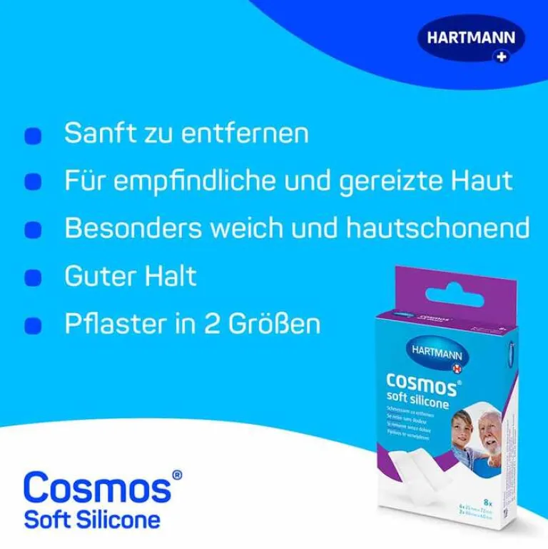 cosmos® soft silicone Pflaster eignen sich zur besonders sanften Wundversorgung selbst bei empfindlicher oder gereizter Haut. Dank des verwendeten Silikonklebers haftet cosmos® soft silicone gut und kann dennoch sanft von der Haut gelöst werden.