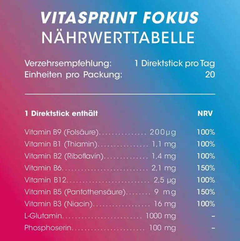 - bleiben Sie konzentriert: Vitasprint Fokus ist Ihr Begleiter im hektischen Alltag oder Zeiten intensiven Arbeiten und Lernens*