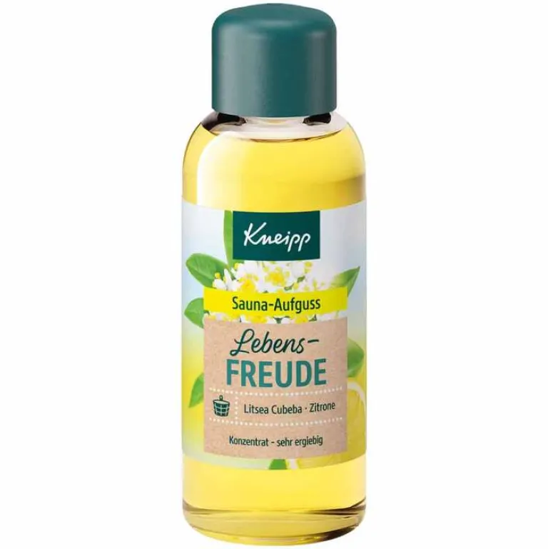 Dies bewirken die natürlichen ätherischen Öle der Litsea Cubeba und der Zitrone, die einen frischen, heiteren Duft verbreiten. Auf Grund der wohltuenden Wirkung bietet der Kneipp Sauna-Aufguss eine wirkungsvolle Ergänzung regelmäßiger Saunagänge.