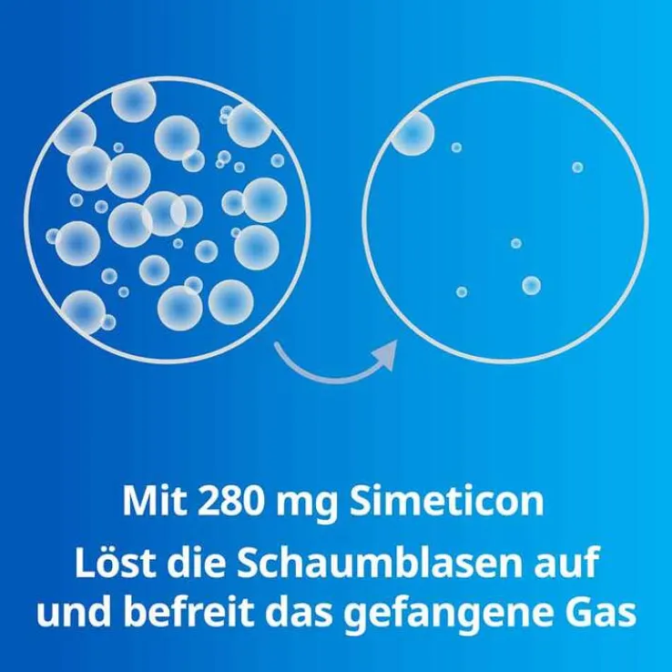 Simeticon reduziert die Oberflächenspannung der Gasbläschen. So bewirkt der bewährte Wirkstoff die Zusammenlagerung der Gasbläschen im Darm. So kann die Gasspannung verringert, das Entweichen des Gases erleichtert und können die Beschwerden gelindert werden. Simeticon zeichnet sich durch sehr gute Verträglichkeit aus: der rein physikalisch agierende Wirkstoff wird nicht vom Körper aufgenommen.