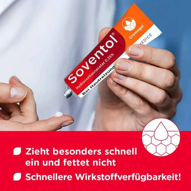 Soventol® Hydrocortisonacetat 0,25% 2,5 mg/g Creme. Anwendungsgebiete: Zur Behandlung von entzündlichen und allergischen Dermatosen (Hautentzündungen und Ekzeme) mit geringer bis mittlerer Symptomausprägung, die auf eine äußerliche Behandlung mit schwach wirksamen Corticosteroiden ansprechen. Zu Risiken und Nebenwirkungen lesen Sie die Packungsbeilage und fragen Sie Ihre Ärztin, Ihren Arzt oder in Ihrer Apotheke. Stand 07/2022. MEDICE Arzneimittel, 58638 Iserlohn