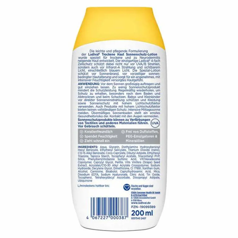 Sonnenstrahlen gibt es in verschiedenen Wellenlängen. Sie haben verschiedene Auswirkungen auf die Haut, wirken jedoch alle zellschädigend. Daher ist es wichtig einen Sonnenschutz zu verwenden, der rundum schützt. Dank einzigartigem 4-fach Zellschutz schützt die Ladival® Trockene Haut Sonnenschutz-Lotion vor UV-A- und UV-B-Strahlen, vor den Folgen der Infrarot-A-Strahlung und sichtbarem Licht (einschließlich blauem Licht). So wird die Haut auch vor einer vorzeitigen, sonnenbedingten Hautalterung geschützt.