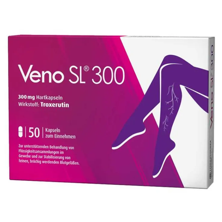 Veno SL® 300. Wirkstoff: Troxerutin. Anwendungsgebiete: Entgegenwirken der Bildung von Ödemen (Ödemprotektivum), Verbesserung der Fließfähigkeit des Blutes, zur unterstützenden Behandlung bei Flüssigkeitsansammlungen im Gewebe (exsudative Prozesse) und zur Stabilisierung von feinen, brüchig werdenden Blutgefäßen (Kapillarfragilität). Zu Risiken und Nebenwirkungen lesen Sie die Packungsbeilage und fragen Sie Ihre Ärztin, Ihren Arzt oder in Ihrer Apotheke. URSAPHARM Arzneimittel GmbH, Industriestraße 35, 66129 Saarbrücken, www.ursapharm.de. Stand: März 2019