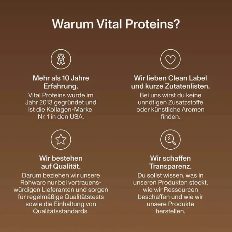 Durch die hohe Bioverfügbarkeit werden die Kollagen-Peptide optimal vom Körper aufgenommen. Das Kollagen ist zudem Paleo-freundlich und glutenfrei, perfekt für eine ausgewogene Ernährung. Vital Proteins Collagen Peptides enthalten Kollagen-Peptide und Kakaopulver mit einem Hauch von Stevia.