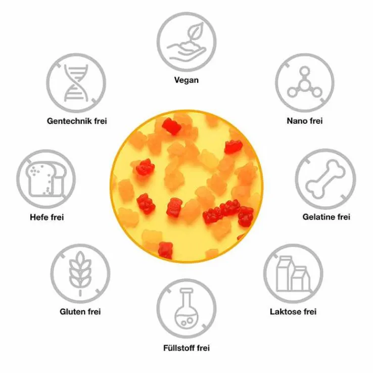 Malzsirup, Zucker, Dextrosemonohydrat, Pektin, Zitronensäure, Cholecalciferol (Vitamin D3, vegan – aus Flechten) (1%), Natriumcitrat, natürliches Orangenaroma, Pflanzenöl, Beta-Carotin.