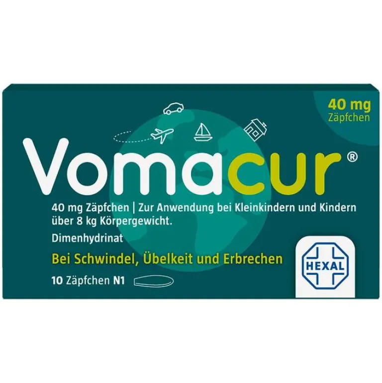 Vomacur® 40 mg Zäpfchen sind zur Behandlung von Reisekrankheit, Übelkeit, Schwindel und Erbrechen bei Kleinkindern und Kindern über 8 kg Körpergewicht geeignet. Bei bekannter Neigung zu Reiseübelkeit kann das Arzneimittel auch vorbeugend eingenommen werden und lindert das flaue Gefühl in der Magengegend, dank des bewährten Wirkstoffs Dimenhydrinat. Vomacur® 40 mg Zäpfchen sind bei richtiger Dosierung verträglich und auch für Kleinkinder über 8 kg Körpergewicht geeignet. Bitte halten Sie sich genau an die Dosierung, weil Überdosierungen insbesondere für Kleinkinder schnell gefährlich werden können.