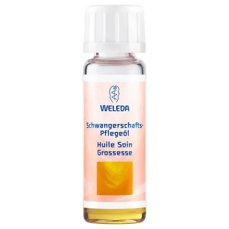 Das Weleda Schwangerschafts-Pflegeöl schützt die Haut, die durch die körperlichen Veränderungen in der Schwangerschaft zu Trockenheit neigt, vor dem Austrocknen. Von Beginn der Schwangerschaft an bis drei Monate nach der Geburt regelmäßig einmassiert, beugt es Dehnungsstreifen an Bauch, Oberschenkel, Po und Brust vor.