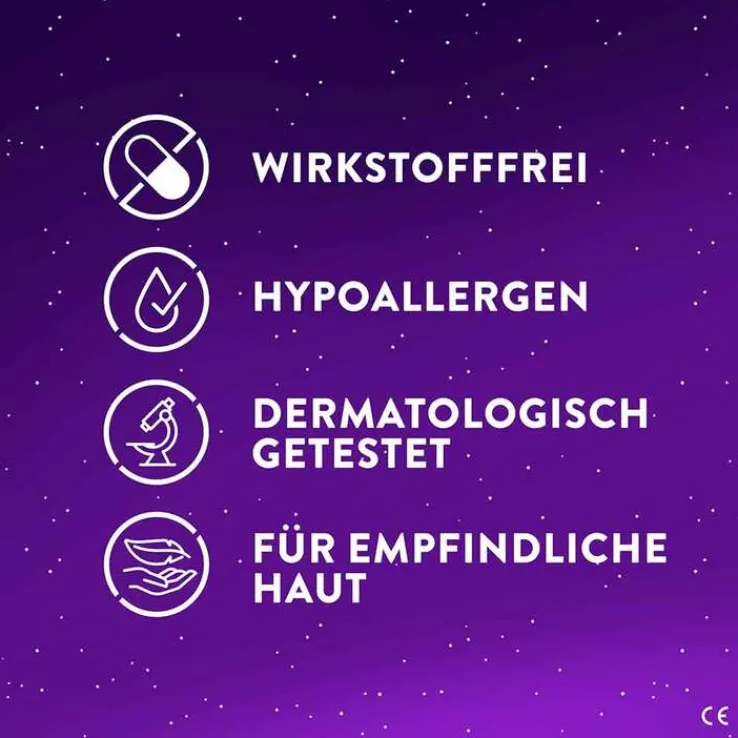 Konturierte sanfte 4-Punkte-Technologie: Hilft, die ganze Nacht zu haften. Öffnet die Nasengänge für leichteres Atmen während der Nacht. WICK ZzzQuil® Gute Nacht Nasenstrips sind geeignet für empfindliche Haut, die Strips sind hypoallergen und dermatologisch getestet. Die Strips lassen sich einfach entfernen, sind geruchsneutral und frei von Duftstoffen.