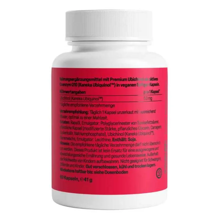 Rapsöl, Emulgator: Mono- und Diglyceride von Speisefettsäuren, Kapselhülle: Gelatine (Rein Rind), Feuchthaltemittel: Glycerin, Ubichinol (6,6% Kaneka QHTM), Überzugsmittel: Bienenwax, Emulgator: Lecithin, Farbstoff Softgelkapsel: Zuckercoleur.
